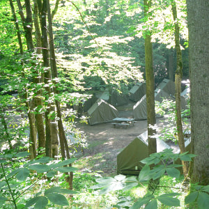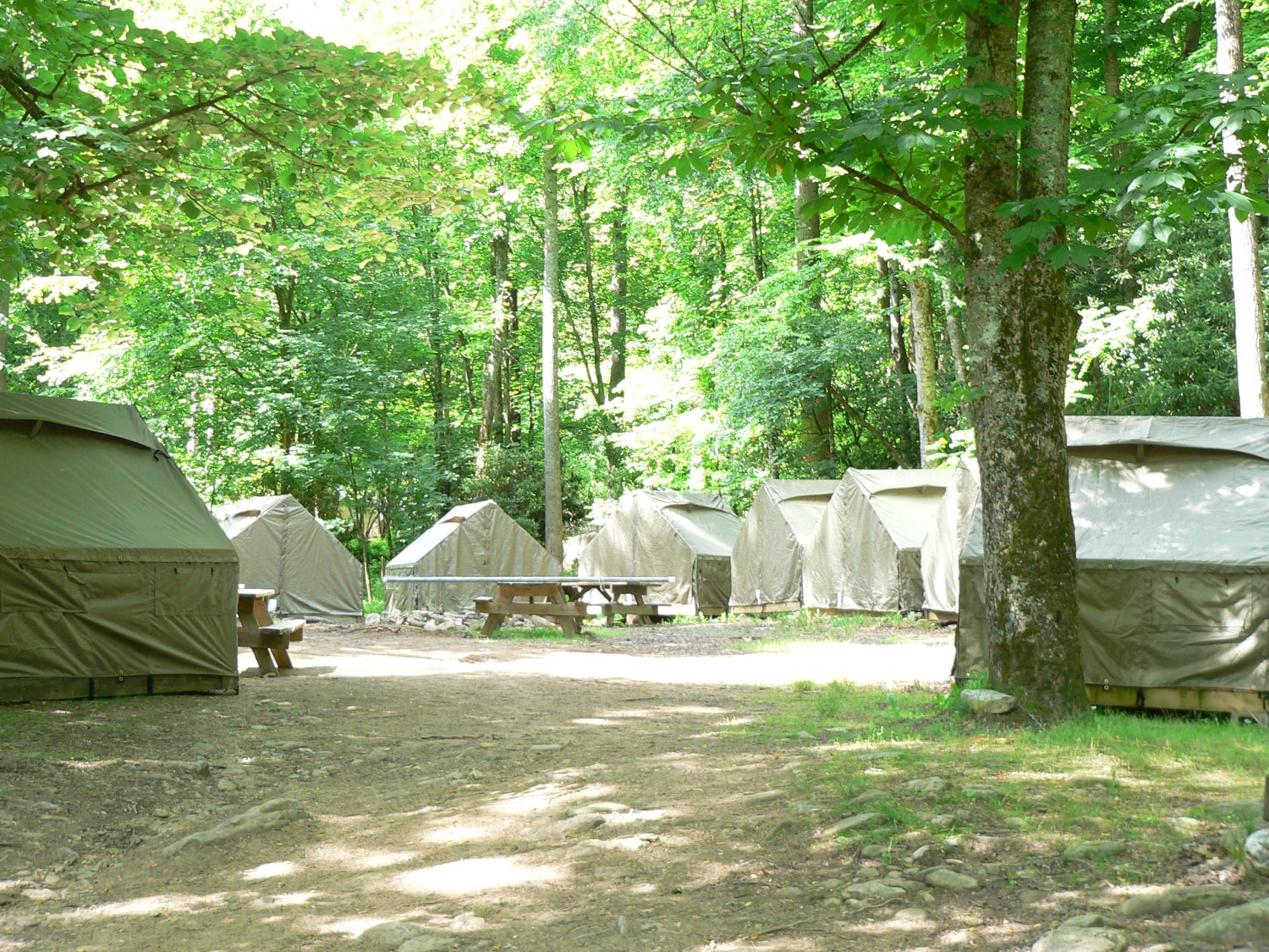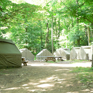 Iroquois campsite is located near Powhatan and Creek campsites and the Little East Fork of the Pigeon River. The site is equipped with 33 tents, each with a wooden floorboard and 2 cots. Total site occupancy is 66 people. The site is shaded and is close to the dining hall and main camp.